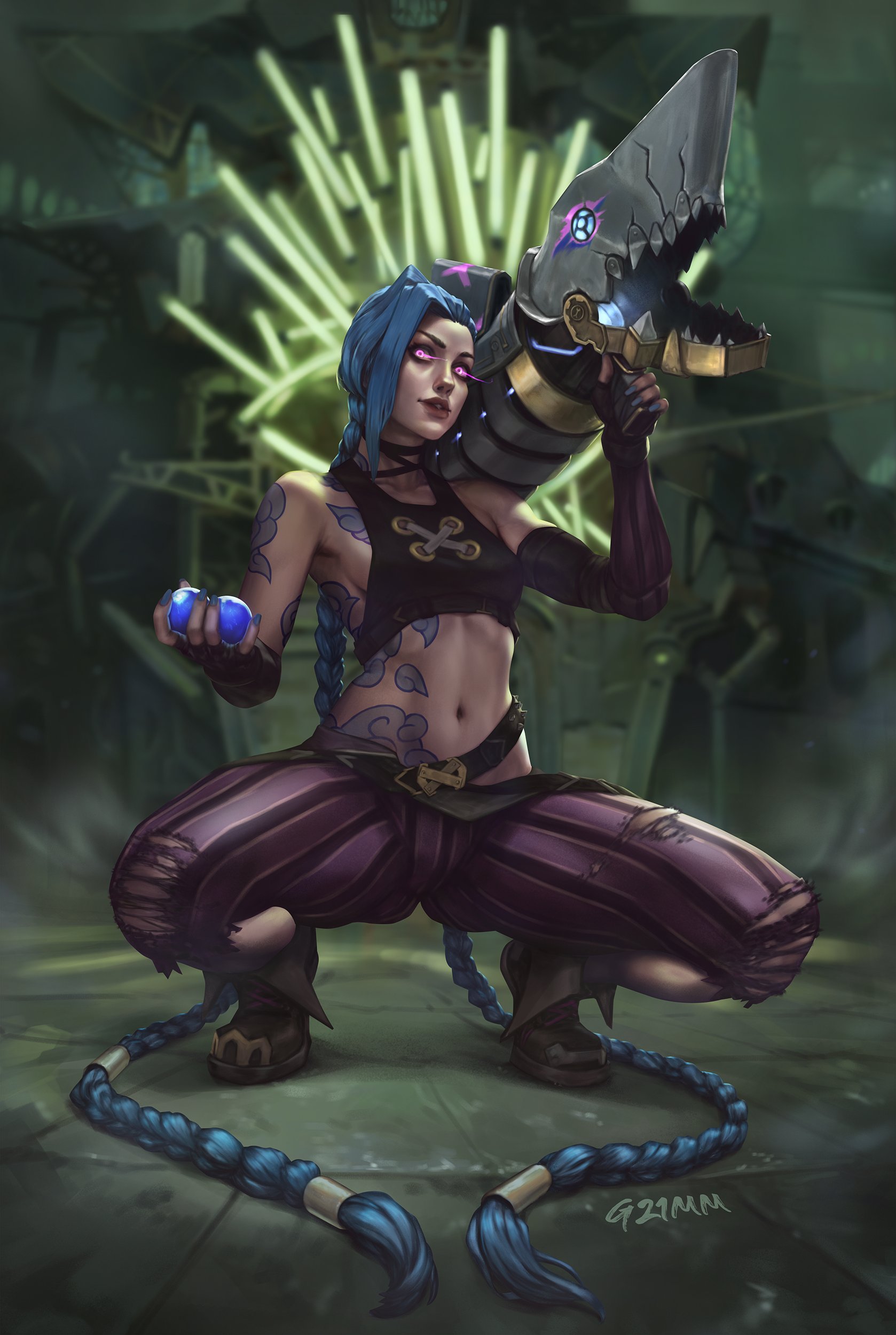 Grasping the power of Hextech in one hand, and brandishing her signature launcher in the other, Jinx lingers in the glow of the Last Drop.